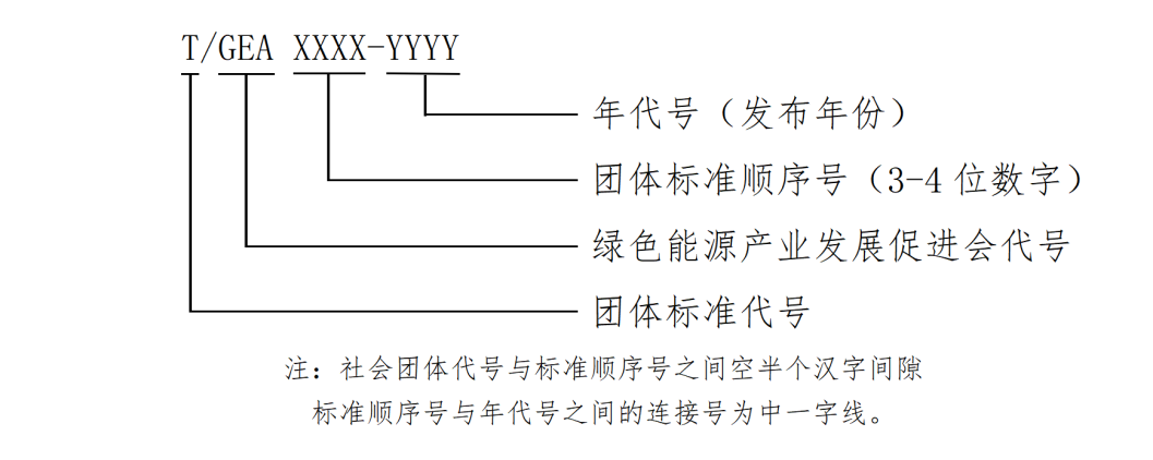 第五条 本会团体标准编号依次由团体标准代号(T)、绿色能源产业发展促进会代号(GEA)、团体标准顺序号、年代号(发布年份)组成,具体表示如下: